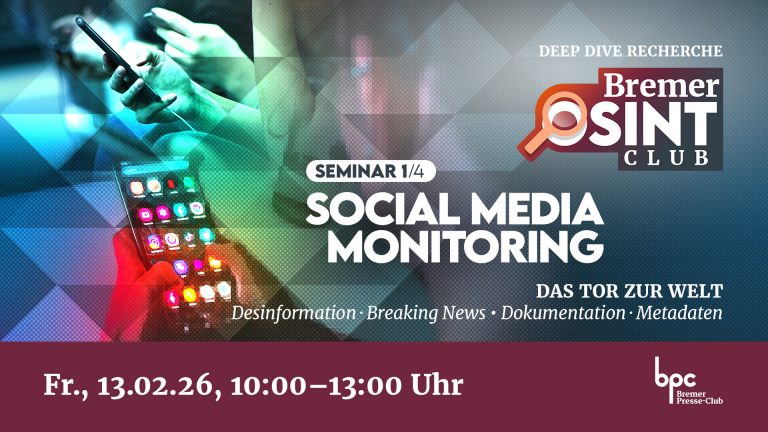 Wann & Wo: Freitag 13. Februar 2026, 10-13 Uhr, im Bremer Presseclub, Schnoor 27 (Seminarraum im OG)